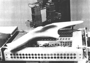 Das Belegen eines Schaumkernes mit Kohlefaser - Gewebe mit Hilfe eines Stoff - Greifers. Der Schaumkern liegt auf einem weiteren Greifer, der robotergeführt den einseitig mit Kohlefaser belegten Kern in eine Form einlegt. Dort wird dann die andere Seite des Schaumkernes mit Kohlefaser - Gewebe belegt.