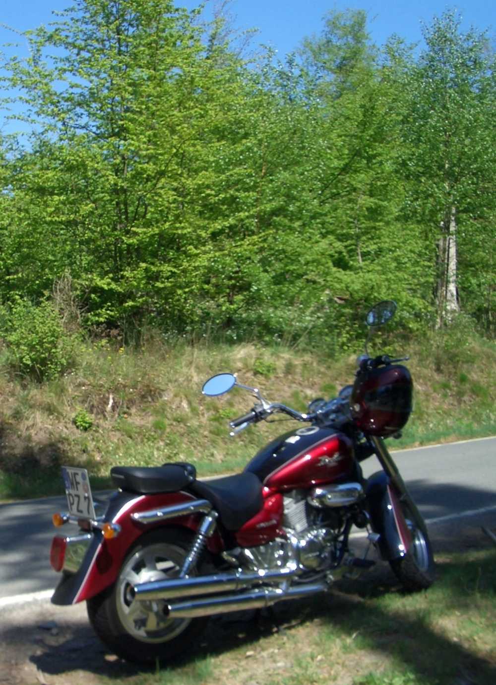 Harley-Freaks grüßen. Ungläubig das die nur 125 ccm hat und so gut mithält, manche merken es erst am zweiten Touren-Tag. War damit schon von Hornburg über Solling, Rhön und Thüringerwald zurück durch den Harz. Ferner von Hornburg, Harz, Kyfhäuser, Weimar, Chemnitz und zurück. (immer ca. 10 Maschinen) Am liebsten einmal rund um und durch den Harz. (meist allein am Sonntag von 10:00 bis 14:00) |