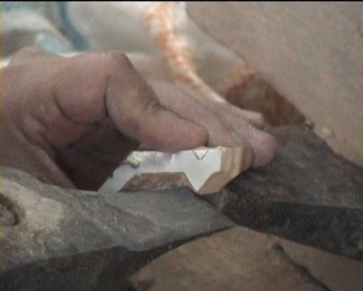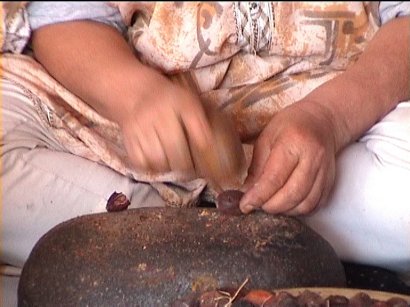 Die Kerne der Ziegenbaumfrucht werden aufgeschlagen The cores of the goat - tree - fruits become open by stone punch |
