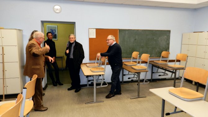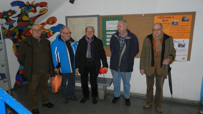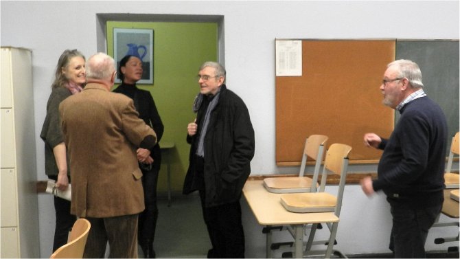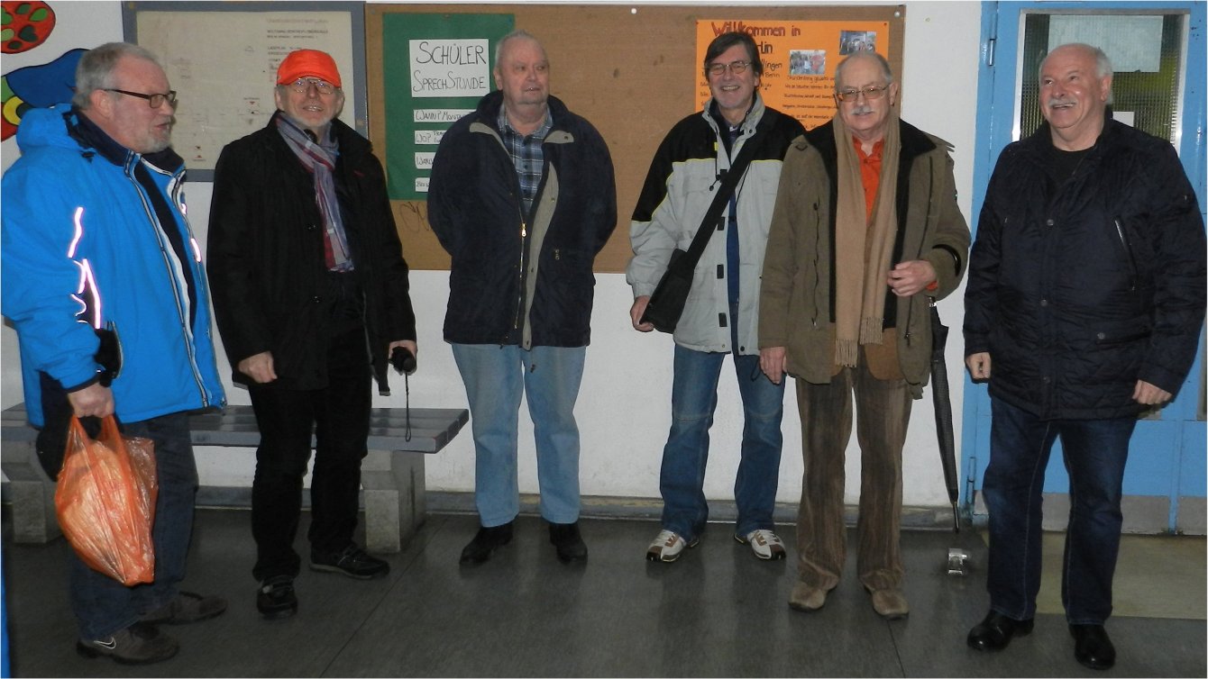 Bernd erbarmt sich und macht von uns (fast) allen ein Gruppenfoto (unten). Danach begrüßte uns die stellvertretende Schulleiterin Frau de la Motte und Frau Wünscher, die uns dann durch die "heiligen" Flure und Klassenzimmer führten. |